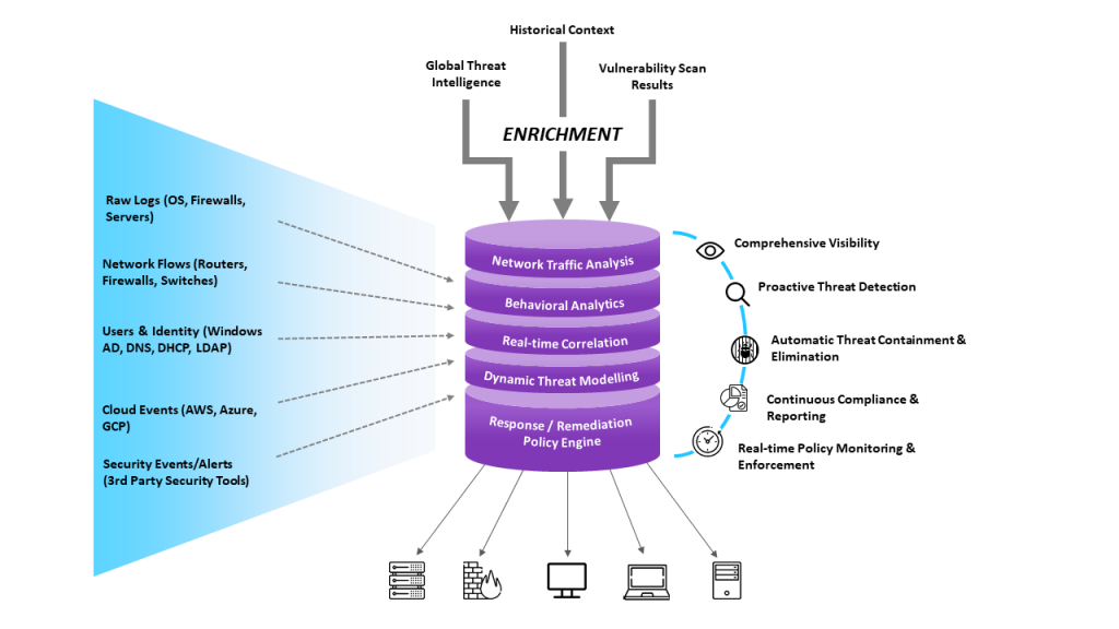 وضعیت امنیتی سالم مستلزم دید همه جانبه از تهدیدات سایبری، سوء استفاده ها و حملاتی است که دارایی های IT شما را می توانند هدف قرار دهند. Seceon aiSIEM فهرست معتبری از شاخص‌های تهدید، رویدادهای مرتبط و جریان‌های ترافیک شبکه، غنی‌شده با اطلاعات تهدید، ناهنجاری‌های رفتاری، بافت تاریخی و نتایج اسکن آسیب‌پذیری را به هم متصل می‌کند. در نتیجه، هشدارهای بسیار مؤثر و منسجم بدون هیچ گونه مشکل و پاسخگویی سریع نیمه خودکار یا خودکار به موقع ارایه می دهد.