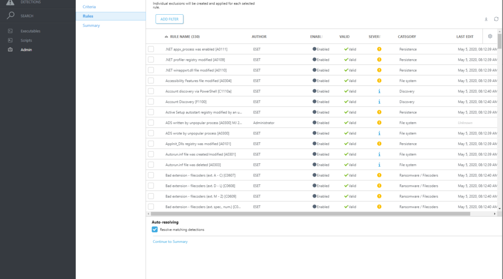 فیلترهای داده را برای مرتب سازی بر اساس محبوبیت فایل، شهرت، امضای دیجیتالی، رفتار یا اطلاعات زمینه اعمال کنید. راه اندازی فیلترهای متعدد امکان شکار خودکار تهدیدات، از جمله APT ها و حملات هدفمند را فراهم می کند که برای هر شرکت قابل تنظیم است. با تنظیم قوانین رفتاری، ESET Enterprise Inspector همچنین می تواند برای شکار تهدید تاریخی سفارشی شود و کل پایگاه داده رویدادها را دوباره اسکن کند.