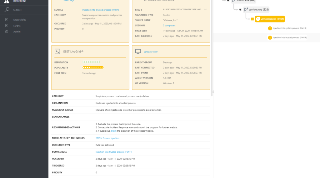 اقداماتی را که توسط یک دستگاه اجرایی انجام شده بررسی کنید و از سیستم LiveGrid® ESET استفاده کنید تا به سرعت ارزیابی کنید که آیا فرایندهای اجرا شده ایمن هستند. امکان نظارت بر حوادث غیرعادی مربوط به کاربر وجود دارد زیرا می توان قوانین خاصی بر اساس رفتار ایجاد کرد. گروه بندی رایانه ها توسط کاربر یا بخش به تیم های امنیتی اجازه می دهد تا تشخیص دهند که کاربر حق انجام عملی خاص را دارد یا خیر.