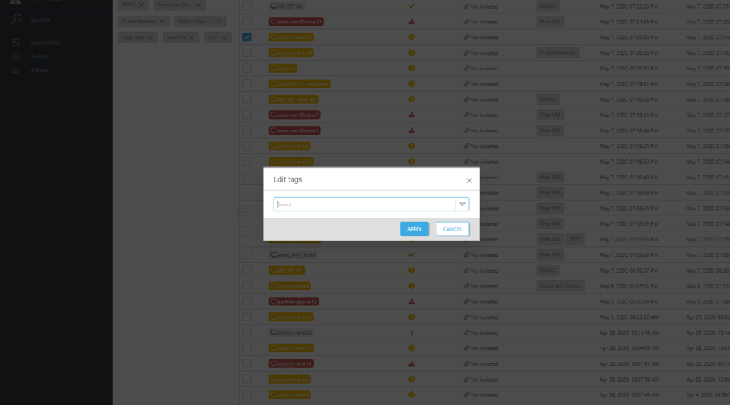 برچسب ها را برای فیلتر کردن سریع اشیا EEI مانند رایانه ها، هشدارها، محرومیت ها، وظایف، اجراها، پردازش ها و اسکریپت ها اختصاص داده و از آنها جدا کنید. برچسب ها بین کاربران به اشتراک گذاشته می شوند و پس از ایجاد، می توان آنها را در عرض چند ثانیه اختصاص داد.